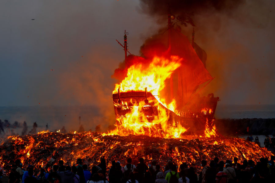The wooden King Boat, which costs millions of dollars, is taken to a local beach at midnight and set on fire early in the morning, to symbolise the "casting out" of plagues and the celestial lord returning to heaven.